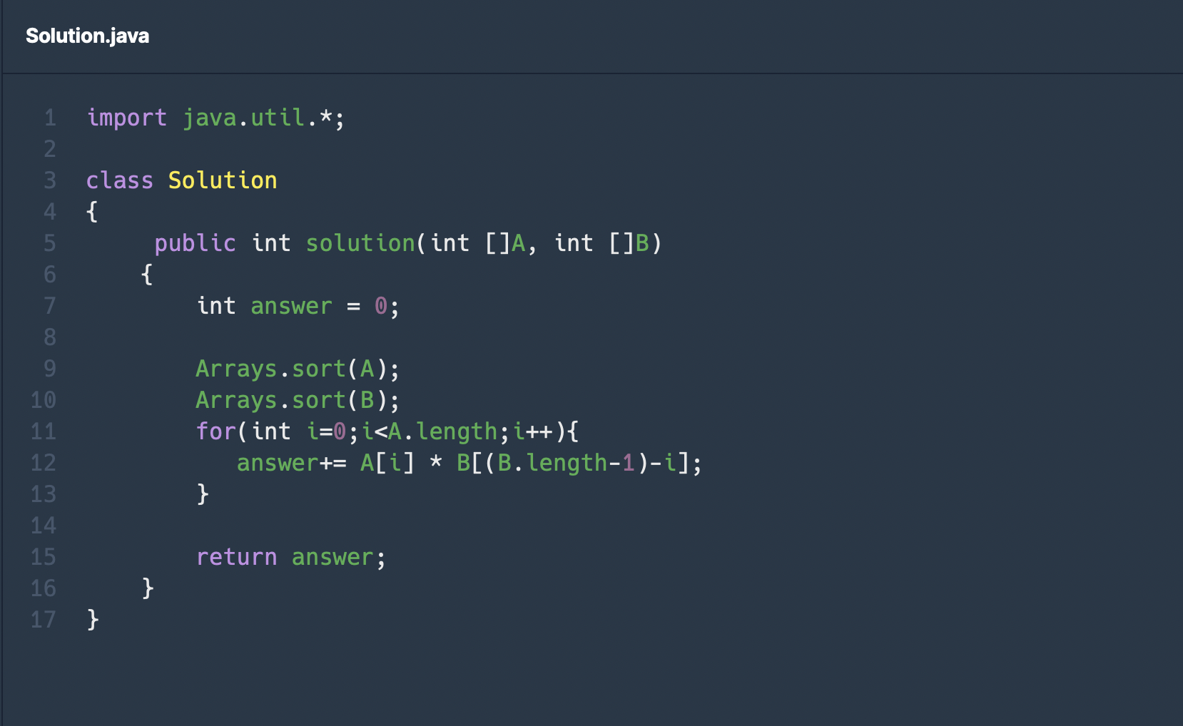 A 배열에서 최솟값 * B 배열에서 최댓값 결과값이 바로 최솟값이었다.