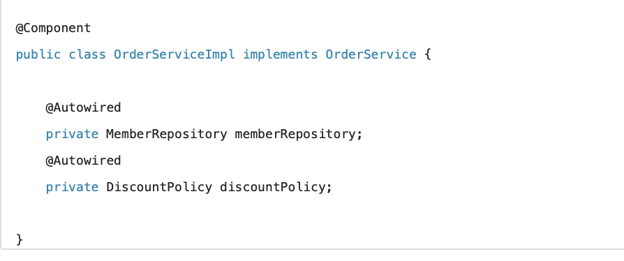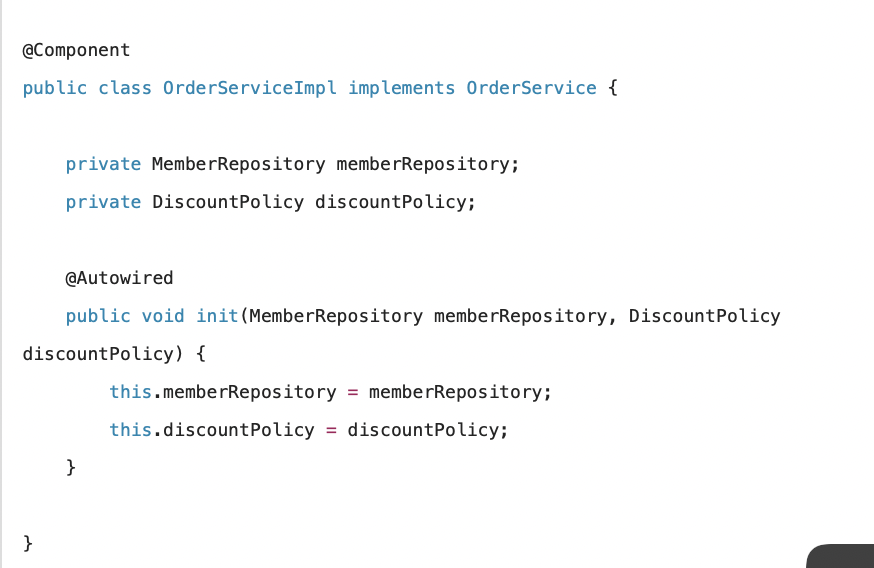 - 수정자 주입을 포함한 나머지 주입 방식은 모두 생성자 이후에 호출되므로, 필드에 final 키워드를 사용할 수 없다. 오직 생성자 주입 방식만 final 키워드를 사용할 수 있다.