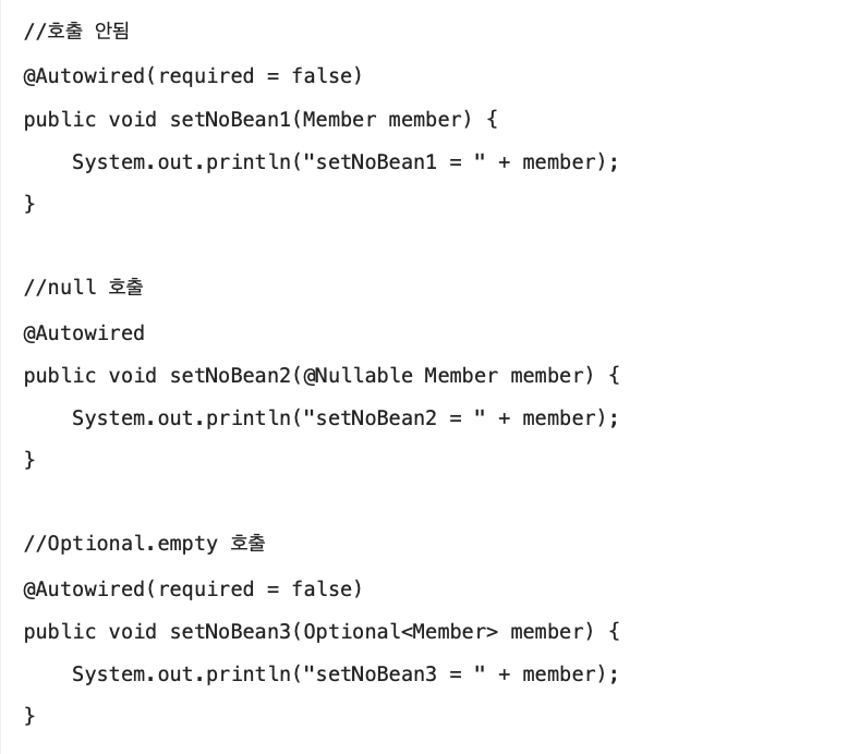 - 주입할 스프링 빈이 없어도 동작해야 할 때가 있다.