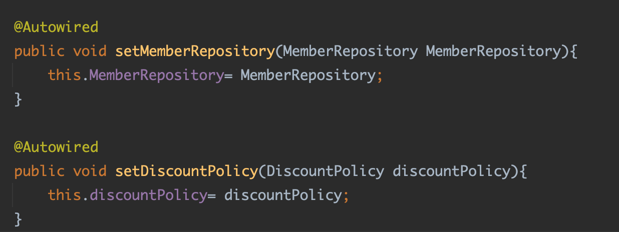 - setter라 불리는 필드의 값을 변경하는 수정자 메서드를 통해서 의존관계 주입하는 방법