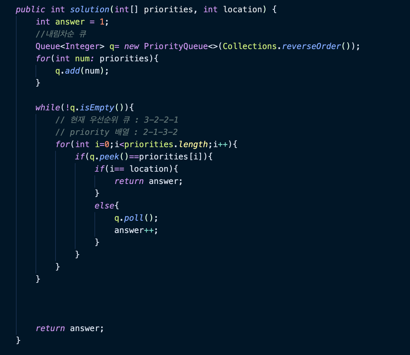 https://school.programmers.co.kr/learn/courses/30/lessons/42587 프로그래머스 코드 중심의 개발자 채용. 스택 기반의 포지션 매칭. 프로그래머스의 개발자 맞춤형 프로필을 등록하고, 나와 기술 궁합이 잘 맞는 기업들을 매칭 받으세요. programmers.co.kr 우선순위 큐를 모르다보니, 뭔가 깔끔하고 정확하게 풀리지 않았다. 배열 인덱스랑 순서를 함께 저장할 수 있는 데이터가 뭐가있을까 고민하다가 계속 복잡해지기만 해서 결국 답지 찾아보고 풀었다. https://blog.naver.com/qotmdgml02/222223051601 [Java] 알고리즘 문제 - 프로그래머스 : 프린터 문제 설명 일반적인 프린터는 인쇄 요청이 들어온 순서대로 인쇄합니다. ..