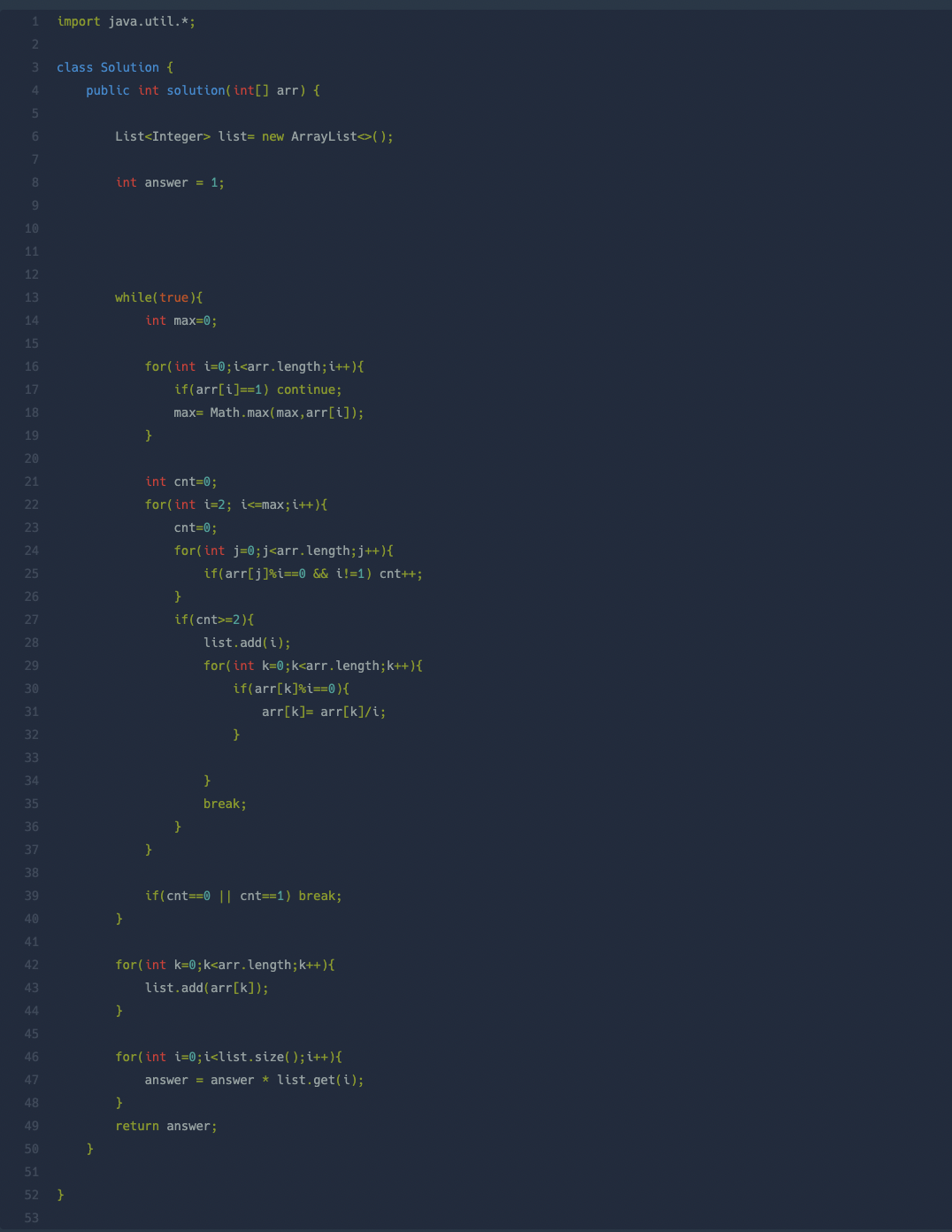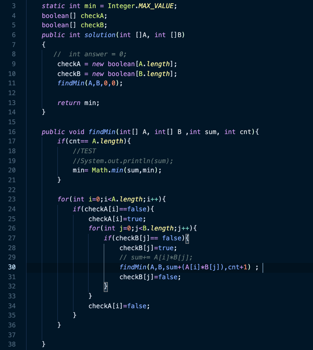https://school.programmers.co.kr/learn/courses/30/lessons/12941 프로그래머스 코드 중심의 개발자 채용. 스택 기반의 포지션 매칭. 프로그래머스의 개발자 맞춤형 프로필을 등록하고, 나와 기술 궁합이 잘 맞는 기업들을 매칭 받으세요. programmers.co.kr 문제 보자마자 완전탐색문제인줄 알고 신나서 풀었다. 근데 시간 초과 (???????????) 아래는 완전탐색으로 푼 문제. 질문들 보니, 완전탐색으로 푸는게 아니라 답은 정해져있었다. A 배열에서 최솟값 * B 배열에서 최댓값 결과값이 바로 최솟값이었다. 그래서 for문을 통해서 정답을 쉽게 구할 수 있었다. 허무하군뇨.