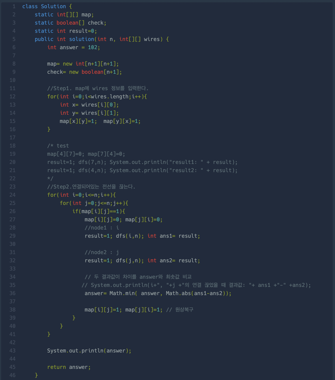 https://school.programmers.co.kr/learn/courses/30/lessons/86971 프로그래머스 코드 중심의 개발자 채용. 스택 기반의 포지션 매칭. 프로그래머스의 개발자 맞춤형 프로필을 등록하고, 나와 기술 궁합이 잘 맞는 기업들을 매칭 받으세요. programmers.co.kr STEP1. 모든 연결되어있는 조합 중 하나씩 바꿔서 둘로 나눈다. : map[i][j]=0, map[j][i]=0 으로 임시 변경 후 원상복구 STEP2. 나눠진 노드에서, 서로 연결되어있느 노드의 갯수를 구한다. : dfs 함수 참고 문제 다 푼 후 점검! 생각보다 쉽게 풀렸다. 그래도 다시 보완한다면, 나는 dfs를 리턴형 void로 풀었지만 int 형으로 바꾸는게 더 깔끔할 것 같다. - ..