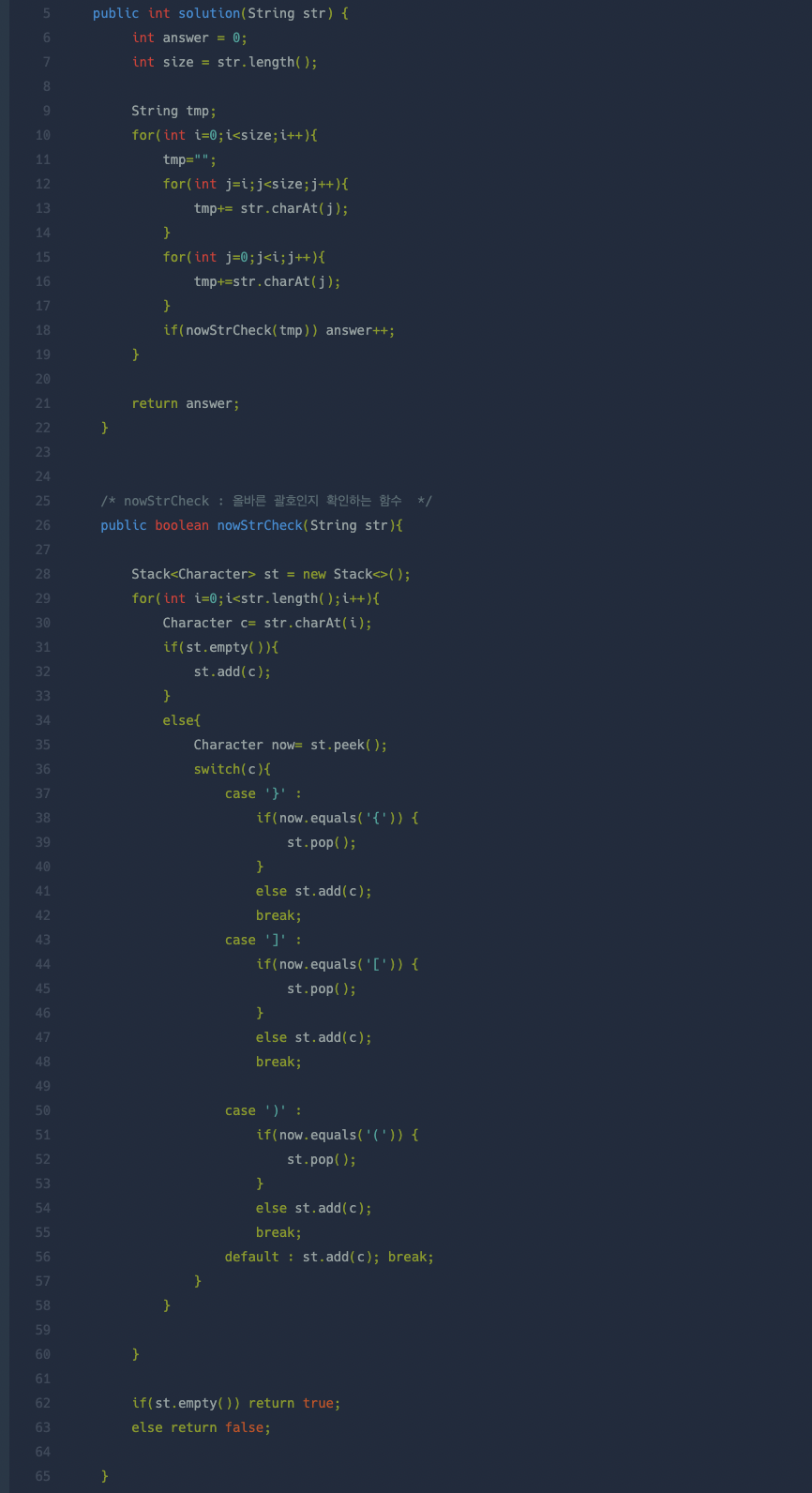 https://school.programmers.co.kr/learn/courses/30/lessons/76502 프로그래머스 코드 중심의 개발자 채용. 스택 기반의 포지션 매칭. 프로그래머스의 개발자 맞춤형 프로필을 등록하고, 나와 기술 궁합이 잘 맞는 기업들을 매칭 받으세요. programmers.co.kr 1. stack에 넣어서 올바른 괄호인지 확인하는 함수 필요 2. 하나씩 줄이는 문자열 변경 함수 필요