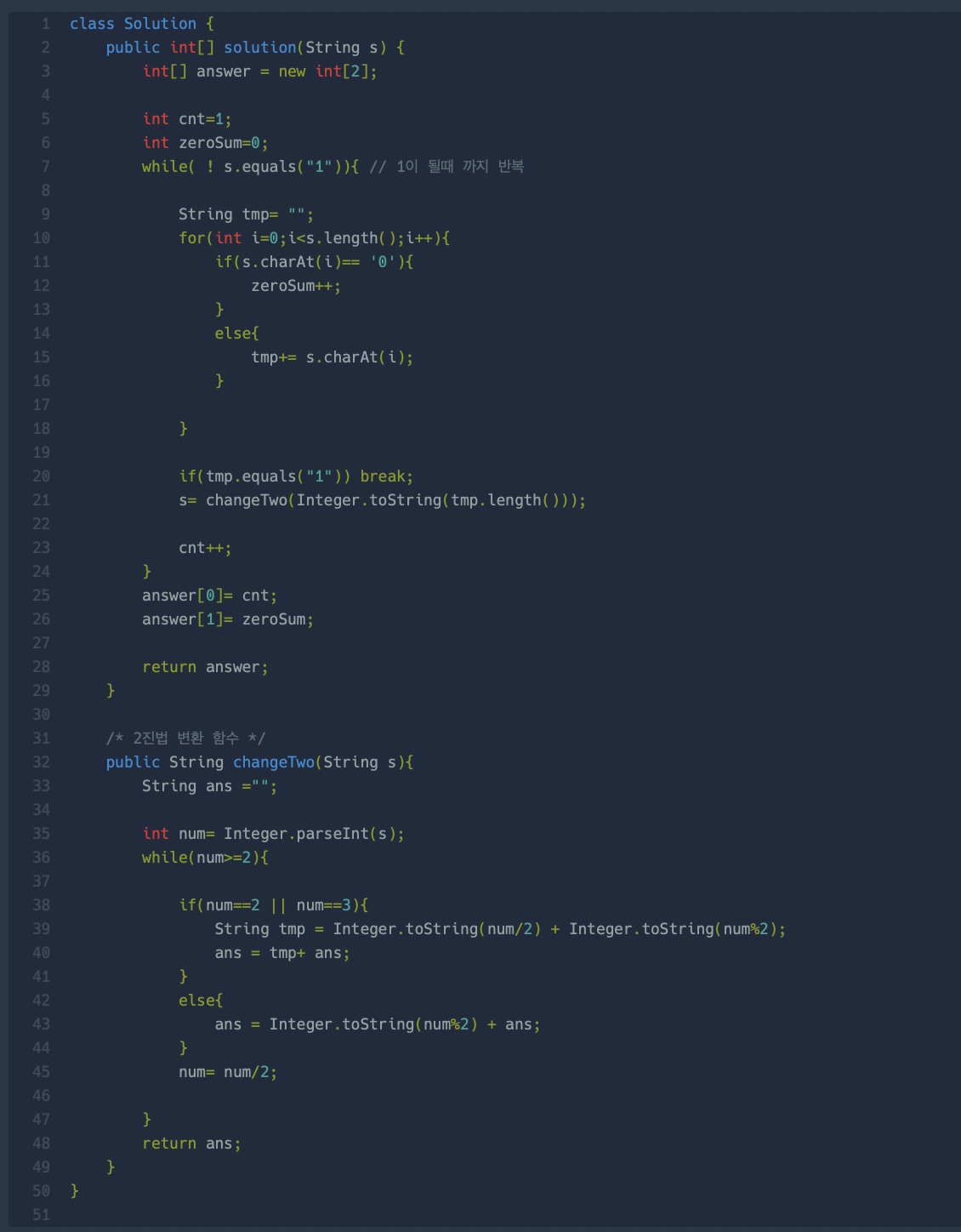 https://school.programmers.co.kr/learn/courses/30/lessons/70129 프로그래머스 코드 중심의 개발자 채용. 스택 기반의 포지션 매칭. 프로그래머스의 개발자 맞춤형 프로필을 등록하고, 나와 기술 궁합이 잘 맞는 기업들을 매칭 받으세요. programmers.co.kr 단순하게 생각나는 대로 풀었다. 1. while 문을 1이 될때까지 실행. - string에 0이 있는 경우 0의 갯수 카운트를 증가시키고, 0이 아닌경우 새로운 stringr값으로 저장한다. 2. chageTwo : 2진법으로 변환하는 함수. 2진법으로 변환한 값을 리턴값으로 준다. 아래는 제출한 코드