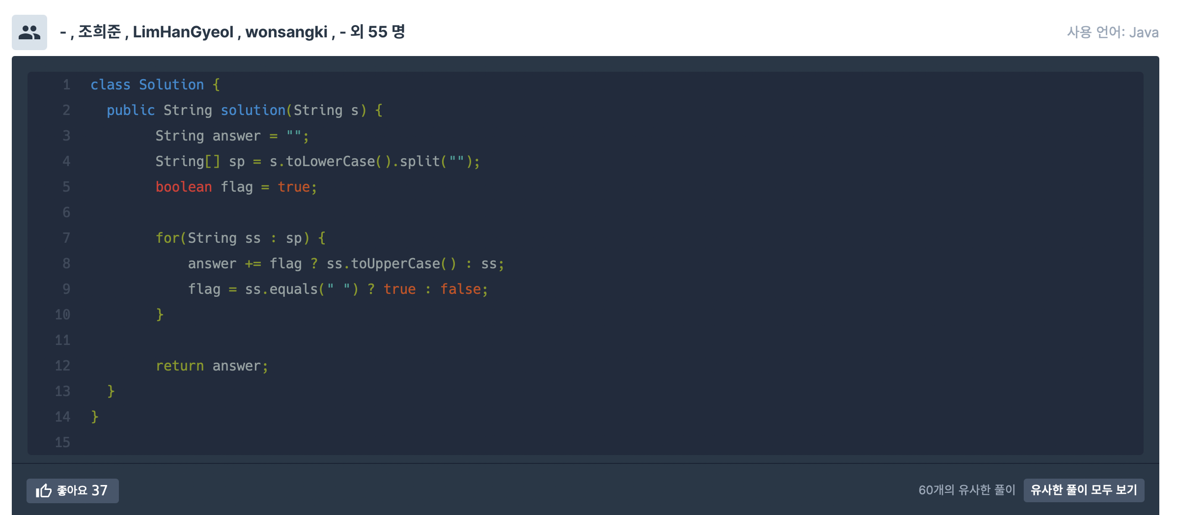 https://school.programmers.co.kr/learn/courses/30/lessons/12951 프로그래머스 코드 중심의 개발자 채용. 스택 기반의 포지션 매칭. 프로그래머스의 개발자 맞춤형 프로필을 등록하고, 나와 기술 궁합이 잘 맞는 기업들을 매칭 받으세요. programmers.co.kr 아니 엄청 쉬운문제인줄알고 풀기싫었는데 그냥 풀어보자~ 하는 마인드로 풀었는데 세상에나.정말 까다로웠다. ㄴㅐ 풀이는 너무 지저분해서 아무도 따라하지 않았으면 하는 코드. 모범답안을 보고 어쩜 저리 깔끔하게 생각하고 풀수 있는지 놀랐다. 모범답안 풀이. split 함수를 사용해서 string을 문자하나하나로 치환해주고, ( !! ) 공백, 숫자 - > toUpperCase 함수를 써도 똑같이 공백..