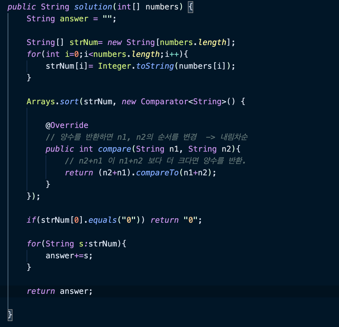 https://programmers.co.kr/learn/courses/30/lessons/42746 코딩테스트 연습 - 가장 큰 수 0 또는 양의 정수가 주어졌을 때, 정수를 이어 붙여 만들 수 있는 가장 큰 수를 알아내 주세요. 예를 들어, 주어진 정수가 [6, 10, 2]라면 [6102, 6210, 1062, 1026, 2610, 2106]를 만들 수 있고, 이중 가장 큰 programmers.co.kr 완탐으로 풀었더니, 메모리 초과 ! Comparable, Comparator 인터페이스를 사용해서 비교해서 푸는 문제였다. 지난 번 공부했다고 생각했는데 구현하려하니까 하나도모르겠음. 복습하고 제대로 머리에 새길겸 보완해서 다시 정리해보았다. https://hyun-1200.tistory.com/6..