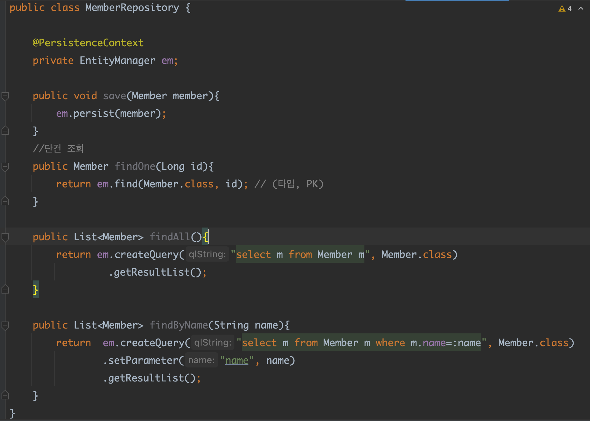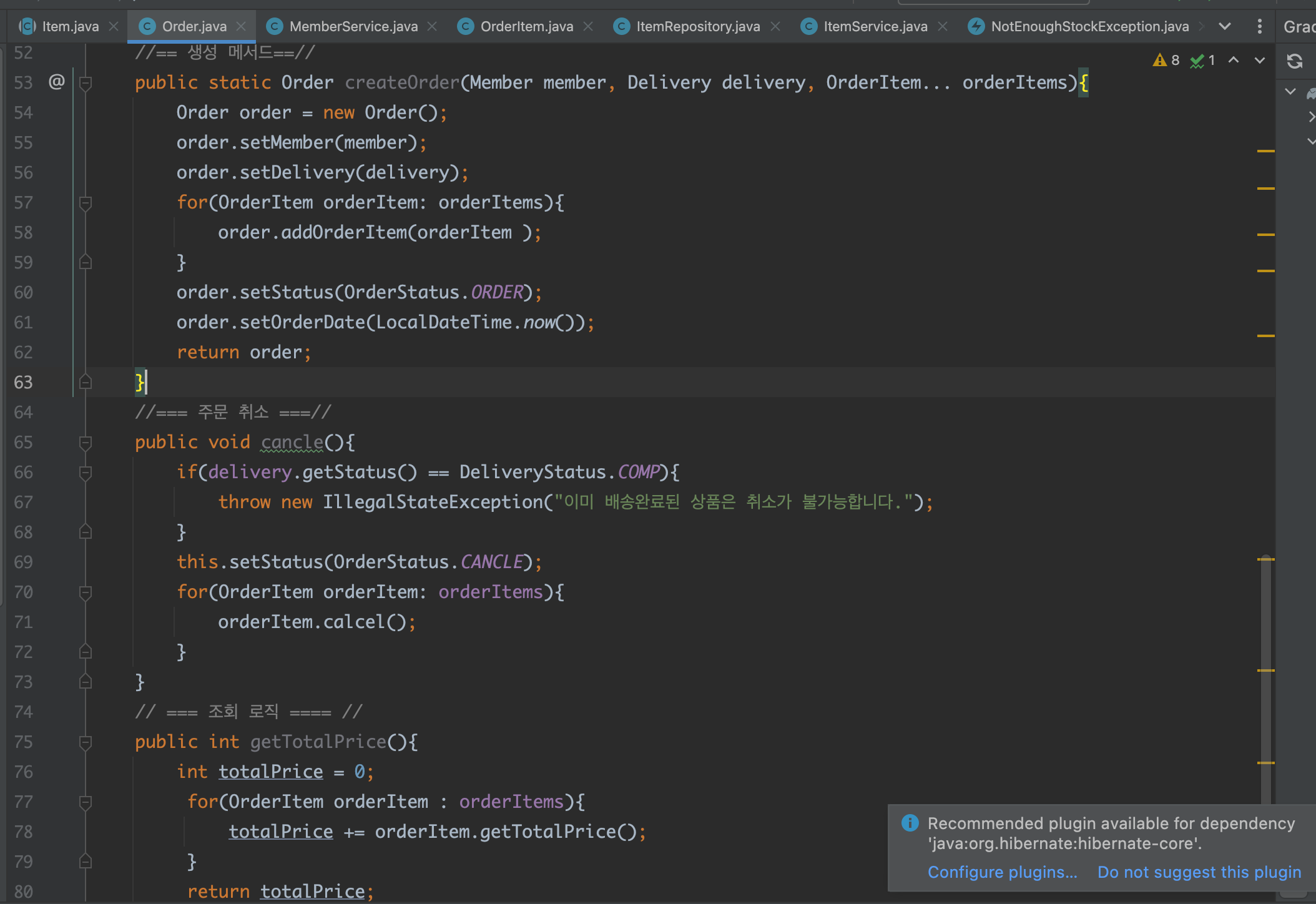 1. 주문, 주문상품 엔티티 개발 : Order / OrderItem 1) Order 클래스에 추가하기 1. 생성메서드 : createOrder ( Member, Delivery, OrderItem...) 2. 주문취소메서드 : cancel() 이미 배송완료된 상태이면, 취소불가 OrderStatus 취소로 변경 OrderItem에서 cancel호출 : 재고수량 원복하는 함수 3. 조회로직 추가 : getTotalPrice() 아이템 가격 * 아이템 갯수 반환 2) OrderItem 클래스에 추가하기 1. 생성메서드 : createOrderItem ( Item, orderPrice, count) 생성 시, 재고에서 주문수량만큼 차감하기 : item.removeStock 2. 비즈니스 로직 : cancel..